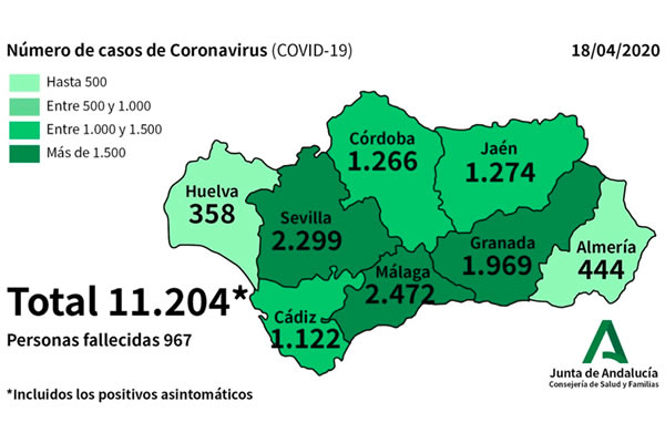 The Junta’s Ministry of Health and Families reports that 151 new cases of Coronavirus have been confirmed in Andalucia in the past day bringing the total number affected in Andalucia to 11,204. The number of cases that have required hospitalisation is 5,341 and, of those, 677 required intensive care. The total death toll since the start of the Covid-19 pandemic has now reached 967 and the number of cured patients has risen to 2,948.