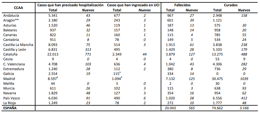 | Provincia | Positivo | Hospitalización | UCI | Fallecimientos | Curados |