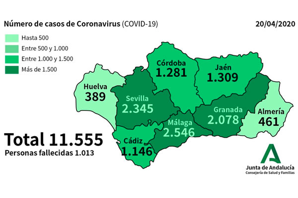 The Junta’s Ministry of Health and Families reports that 130 new cases of Coronavirus have been confirmed in Andalucia in the past day bringing the total number affected in Andalucia to 11,555. The number of cases that have required hospitalisation is 5,473 and, of those, 690 required intensive care. The total death toll since the start of the Covid-19 pandemic has now reached 1,013 and the number of cured patients has risen to 3,229.