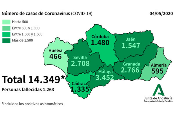The Junta’s Ministry of Health and Families reports that 62 new cases of coronavirus have been confirmed in Andalucia in the past day bringing the total number affected to 14,349. The number of cases that have required hospitalisation is 5,973 and, of those, 738 have required intensive care treatment. The total death toll since the start of the Covid-19 pandemic has now reached 1,263 while the number of cured patients has risen to 7,021.